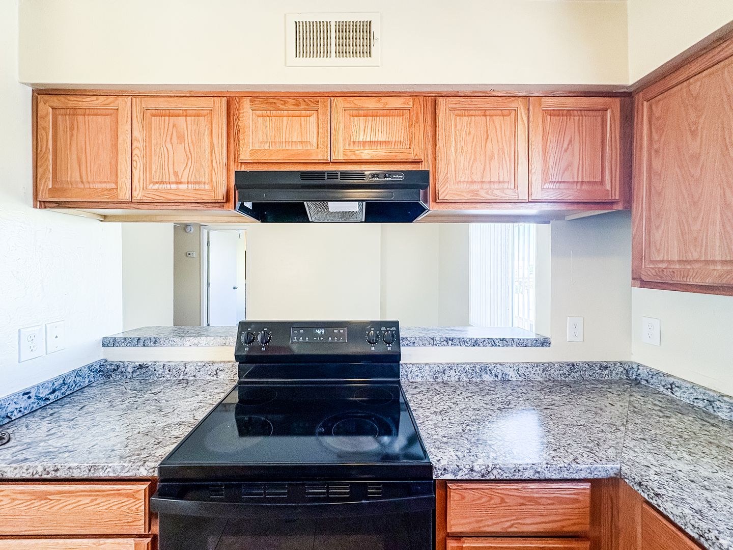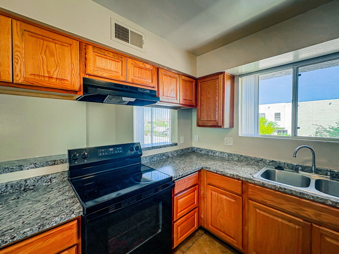 Community kitchens are equipped with oak cabinetry, updated countertops, double sinks, and sleek black appliances, complemented by natural light for a bright and functional cooking space. Bathrooms throughout the community offer a classic, refreshed style with white vanities, ample counter space, and full-sized tub and shower combinations. Generous closet space adds convenience and storage.